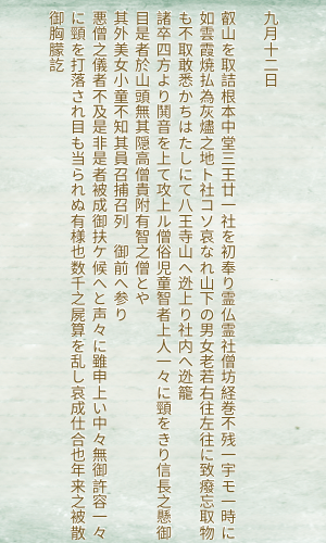 Il cronista, Ōta Gyūichi, descrive la scena con una calma glaciale: “diverse migliaia di cadaveri, tanti da confondere il conto”. Le vittime sono "bonzi malvagi", e il loro destino è "davvero misero". Nessuna compassione. Nessun rimorso.