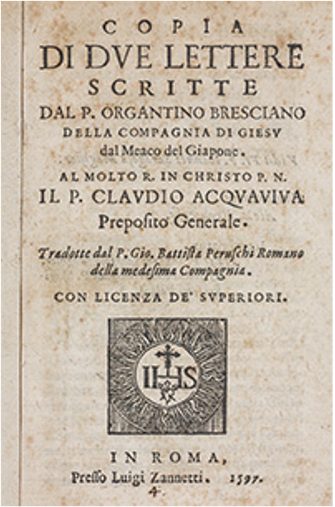 Copia di due lettere scritte dal P. Organtino Bresciano della Compagnia di Giesu dal Meaco del Giapone
